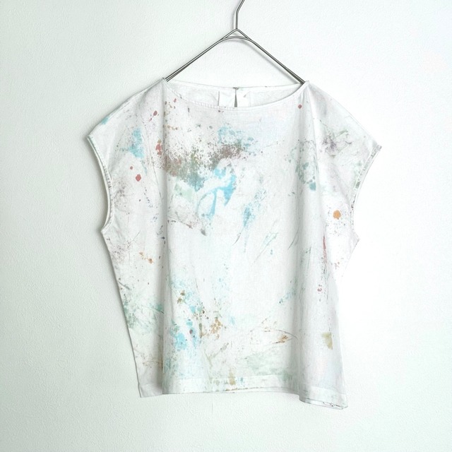 1枚1枚手染めで染色を施している、オリジナルテキスタイルの半袖ブラウスです。 ひとつひとつバランスをみながら、アート作品を描くように染めて仕上げていく1点ものとなります。 写真1〜2枚目が実物の表と裏です。 眺めていて飽きない表情を心がけて制作しています。 色彩や模様が生地にしみこむタッチが残るように描けるのは、 ダイレクトに繊維に染み込む染料ならではの表現です。 着ていると少し気分の上がるような、 日々を彩るピースに加えてもらえたら嬉しいです。 《素材について》 綿麻混紡の生地を採用しました。 麻はコットンに比べ約4倍の吸湿性があると言われています。 水分や汗などを素早く吸い取り、サラっと気持ち良く着る事ができます。 吸収した水分はすぐに発散してくれるので、カビや雑菌の繁殖を防ぎ、嫌なニオイも抑制してくれます。 また水に濡れると強度が増すという特性を持っているため、 生地に負担がかかる洗濯も気兼ねなくできます。 麻は異素材と混紡する事でお互いの良い点を伸ばし、 悪い点を補い合う事ができる素材とも言われています。 麻の特徴であるチクチク感も、コットンを混紡することで柔からさが増し、ふんわりとした肌馴染みの良い風合いになりますので 麻と綿のいいとこ取りです! 《パターンについて》 型はシンプルでゆったりと、ウエストはインでもアウトでも 長く使いやすそうなシルエットを目指して何度か試作をし、 オリジナルのパターンで製作してもらいました。 こちらは工場で縫製後に、染色加工を施しています。 脇も開き過ぎず、でも腕の動きを邪魔しないように。 胸元も見えすぎないよう、背中側にボタンを付けた仕様にしました。 《染色について》 堅牢度(日光や洗濯に対する耐性)の高い染料を使用しておりますので、色鮮やかなまま、長くお楽しみいただけます。 染色堅牢度の検査機関にて、洗濯・汗・摩擦・耐光・ドライクリーニングの試験を受けていずれも問題の無かった染色方法を採用しています。 染色の工程で何度も洗いをかけますので、お届けする段階で 洗い晒しの風合いがお楽しみ頂けます。 手染め手作業の特徴と捉えていただけたらと思います。 何年も着れて長くご愛用いただけるよう、 こだわって製作したブラウスになります。 material:麻55% 綿45% size : レディース フリーサイズ 身幅 59cm 着丈 54cm モデル身長160cm ※写真3枚目以降は別柄です。仕様、サイズ感の参考になさって下さい。 ■ほとんどが1点ものの為、同じ柄の再販の際には写真差し替えをしますので新規出品としております。 そのため売り切れの際には、作品をお気に入りに入れてくださっていても、再販の通知がされません。 よろしければフォローしていただけますと、新規出品時にお気付きになりやすいかと思います。 ■初回のお洗濯時のみ、念のため白物とは分けて洗うことをお勧めしております。 ■お洗濯は中性洗剤をお使いになり、裏返して洗ってください。 洗濯ネットに入れて洗濯機洗いも可能ですが、生地を長持ちさせるためには手洗いを推奨しております。 ■漂白剤のご使用はお控えください。 ■アイロンは綿麻の適温でおかけ下さい。 ■新品の糊が効いた様な、つるっとシワのない素材感ではありません。 染色の工程にて何度も洗いをかけて処理しますので、あらかじめ洗い晒しの風合いのある雰囲気の商品になります。 ■紫外線を長期間浴び続けますと、色褪せが発生する場合があります。保管は直射日光の当たらない場所でお願いいたします。 ■実物の色味がお伝え出来るよう、撮影には充分注意しておりますが、 お使いのモニター・環境によっても見え方に差が出る場合があります事をご了承下さい。 ■配送方法は宅配便を推奨いたします。その他の方法では追跡は出来ても補償ができませんのでご了承のうえでご選択くださいませ。 ■ご質問などは、必ずご注文の前にお願いいたします。