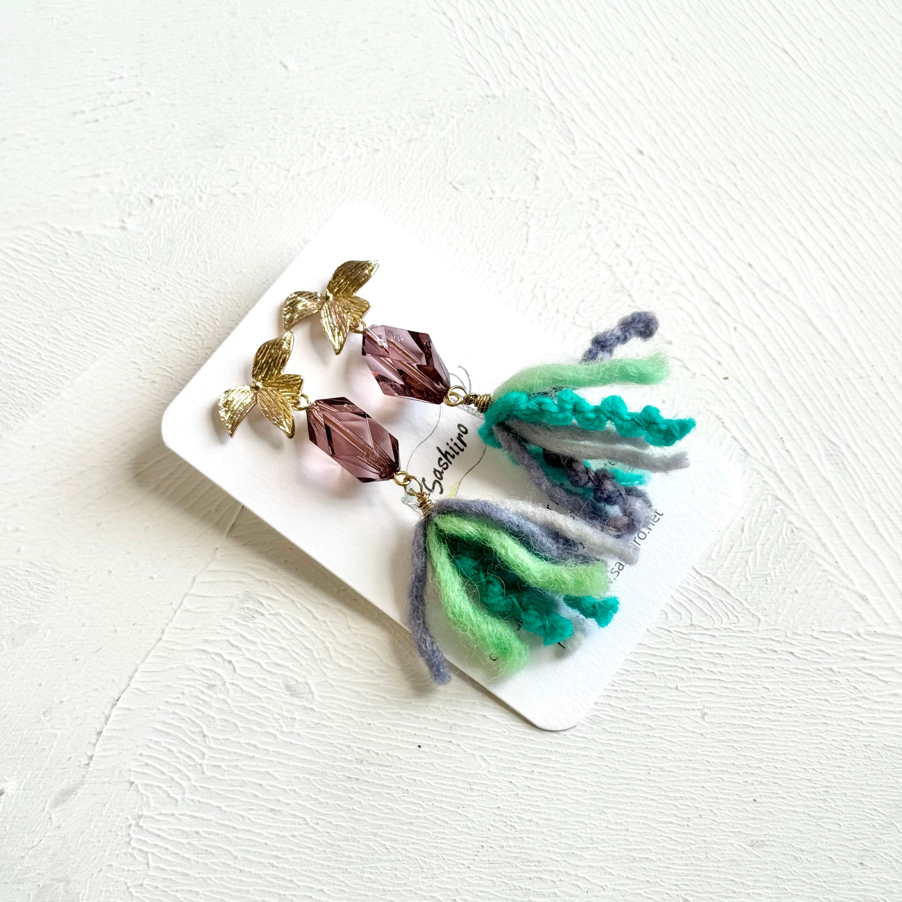 手染めウール糸と手染めビーズのピアス / brown×green